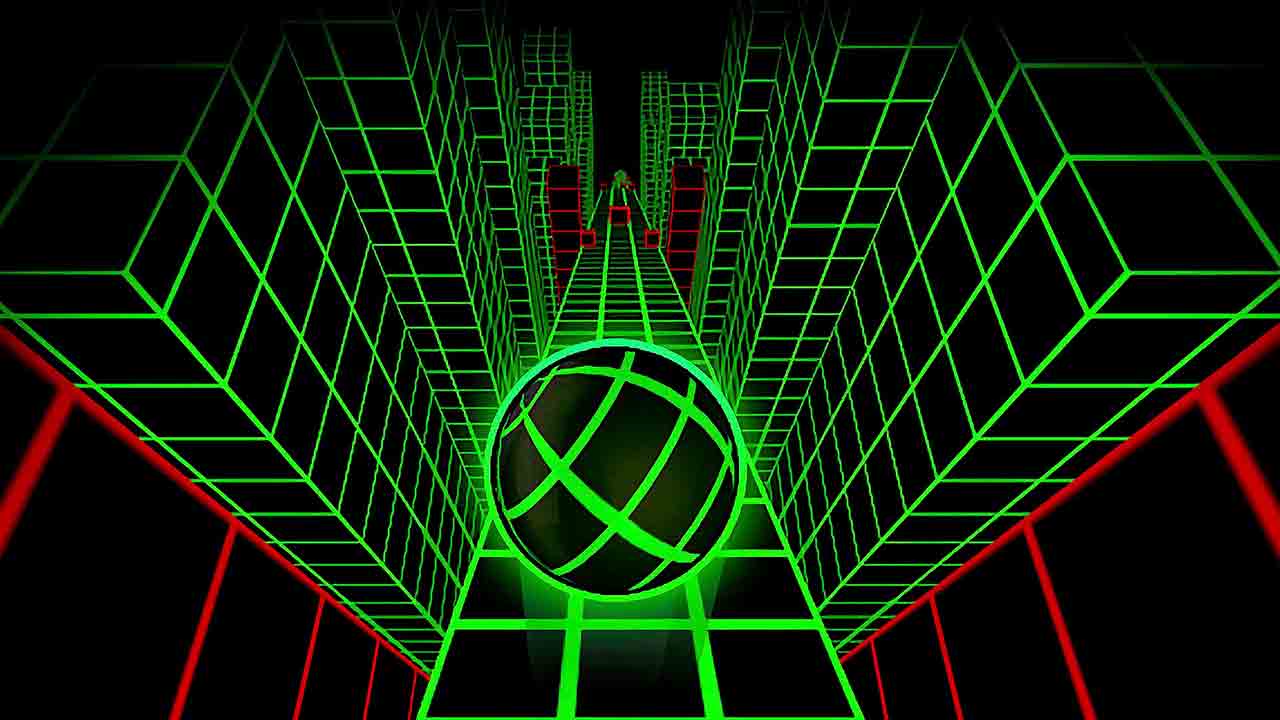 Slope is a 3D endless runner where you control a bright ball rolling down a procedurally generated infinite slope. The objective is simple: survive as long as possible while avoiding red obstacles, gaps, and sharp turns.